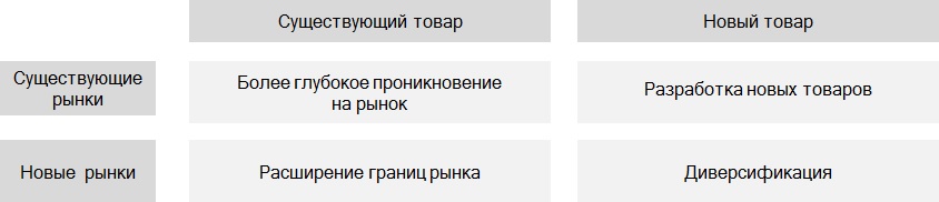 Менеджеры компании должны иметь представления о возможностях стратегического роста компании на рынке. Чаще всего, стратегию определяют две ключевые характеристики: товар, который планирует продавать компания; рынок, на котором планирует действовать компания. Так компания может видеть перспективы выпуска нового продукта на существующем рынке, выхода с существующим товаром на новый рынок или более глубокого проникновения на существующем рынке. Перспективы могут быть систематизированы в матрице И.Ансоффа.