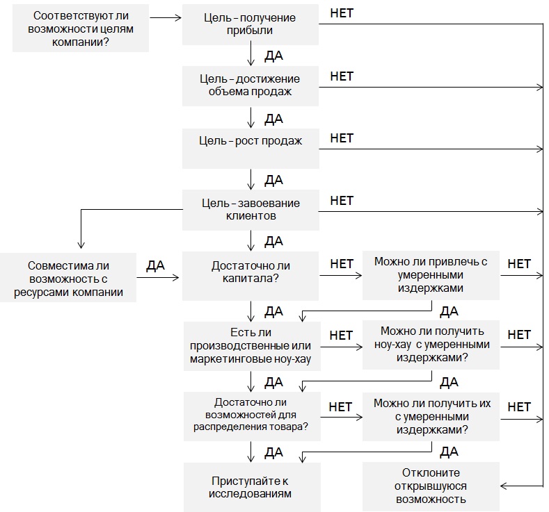 В этой цепочке могут быть исключения, но так или иначе, перед началом детальных исследований вы должны понимать: наличие перспектив, отсутствие конфликтов с идеями и целями компании, возможности для обеспечения замысла доступными ресурсами. Исследование не согласованных с возможностями компании перспектив скорее всего приведет к тому, что маркетинговое исследование окажется бесполезным или не будет доведено до конца.